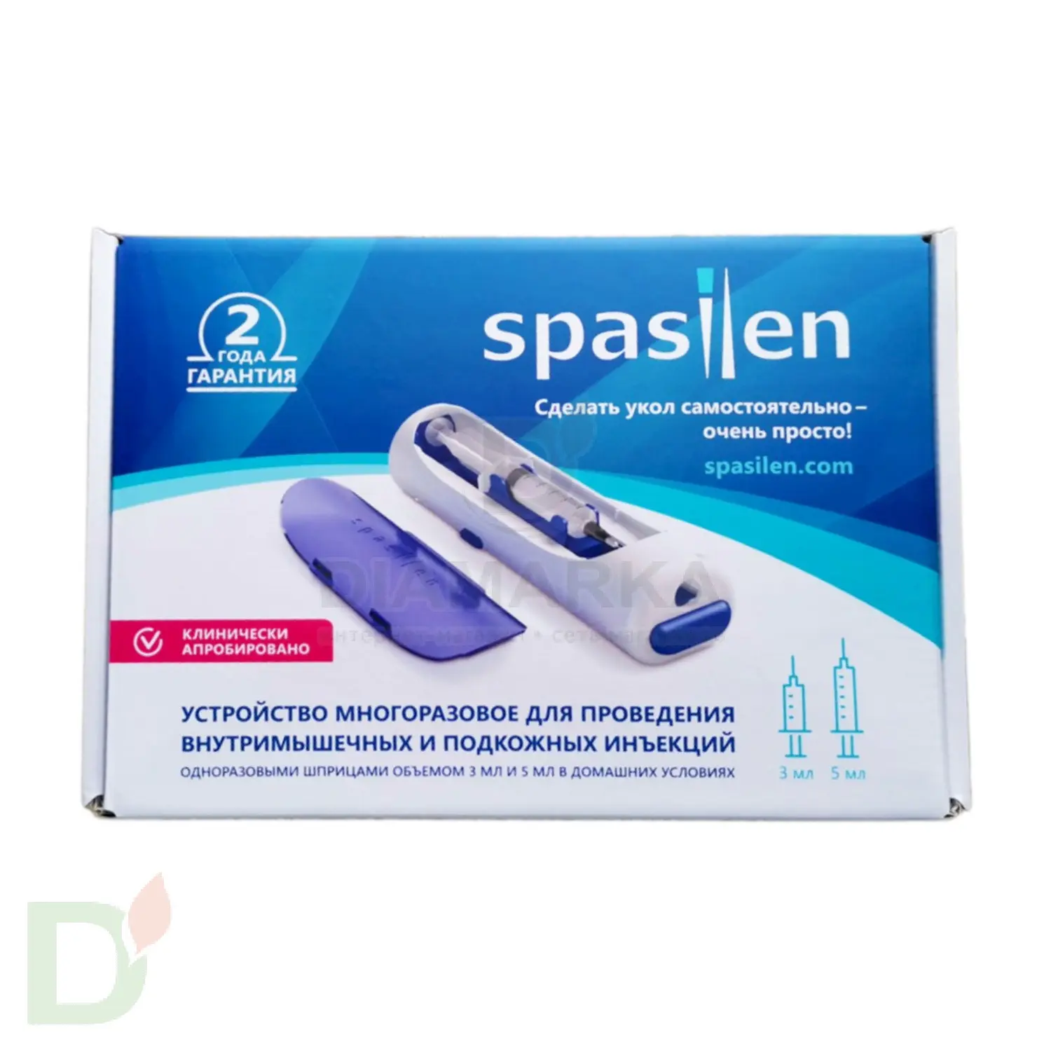 <h2>Спасилен - помощник в проведении самостоятельных безболезненных инъекций</h2> Устройство Спасилен - это автоматическое многоразовое устройство, которое позволяет<br> <ol> <li>сделать укол самому себе, даже если отсутствуют медицинские навыки;</li> <li>снизить боль при выполнении укола</li> </ol> Подходит для проведения как подкожных, так и внутримышечных инъекций шприцами объемом 3 и 5 мл.<br> <br> <h3>Что может Спасилен?</h3> <ul> <li>использование девайса позволяет уменьшить боль от инъекции. Следовательно, снижает страх и психологическое напряжение, которые предшествуют процедуре</li> <li> способствует правильному проведению инъекции</li> <li> при помощи Спасилена легко и просто выполнить инъекцию САМОСТОЯТЕЛЬНО, даже при отсутствии специальных навыков</li> </ul> <h3>Комплектация набора Спасилен <ul> </ul> </h3> <ul> <li>Инъектор Спасилен</li> <li> Сменный картридж для шприца 3 мл – 1 шт</li> <li> Сменный картридж для шприца 5 мл – 1 шт</li> <li> Сниматель колпачка с иглы – 1 шт</li> <li> Руководство по применению – 1 шт</li> <li> Шприцы марки SFM 5 мл с иглой 22G (0.7Х40мм) – 10 шт</li> </ul> Устройство имеет регистрационное удостоверение Росздравнадзора № РЗН 2021/13631